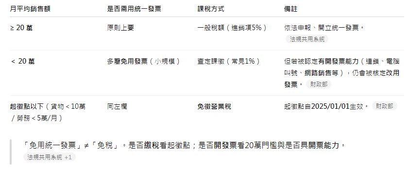 1. 20萬門檻:平均每月銷售額達20萬元,原則上應使用統一發票並按期申報營業稅;未達者,多屬小規模營業人,得由國稅局查定課徵。
