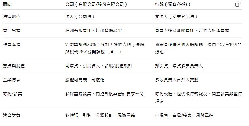 若你追求資本化、引資與風險隔離,公司制更合適;若是小規模自雇/試水溫,行號簡潔好上手。